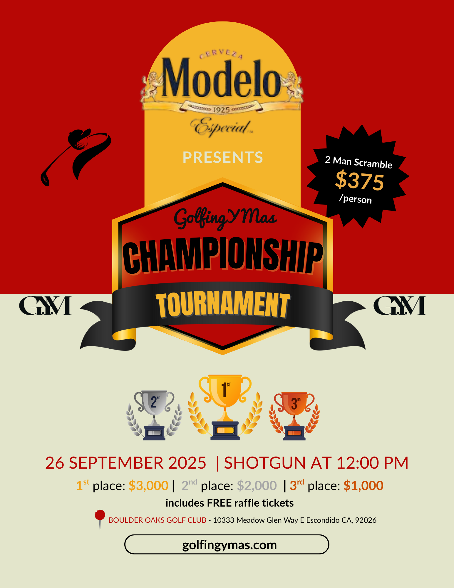 Join us for an unforgettable day on the greens at the Golfing y Más Tournament, proudly sponsored by Modelo, on Friday, October 24th, 2025 at 12:00 PM. The event kicks off with a shotgun start in a 2-man scramble format, perfect for golfers of all skill levels.
